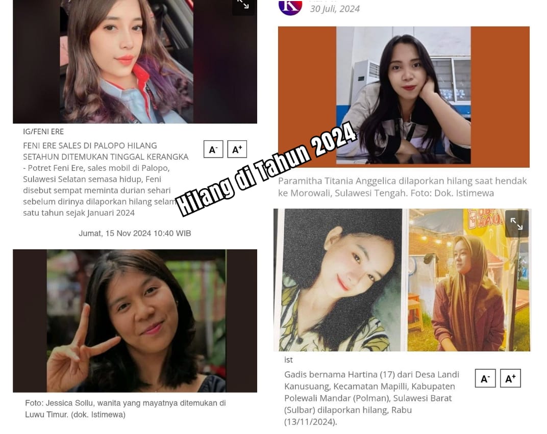 - Paramitha Titania Anggelica alias Mita (26), warga Bottodongga, Desa Bottobenteng, Kecamatan Majauleng, Kabupaten Wajo, Sulawesi Selatan. Dilaporkan hilang ke Polres Wajo pada 23 Juli 2024, diduga menghilang dalam perjalanan ke Kabupaten Morowali, Sulawesi Tengah menggunakan mobil travel.