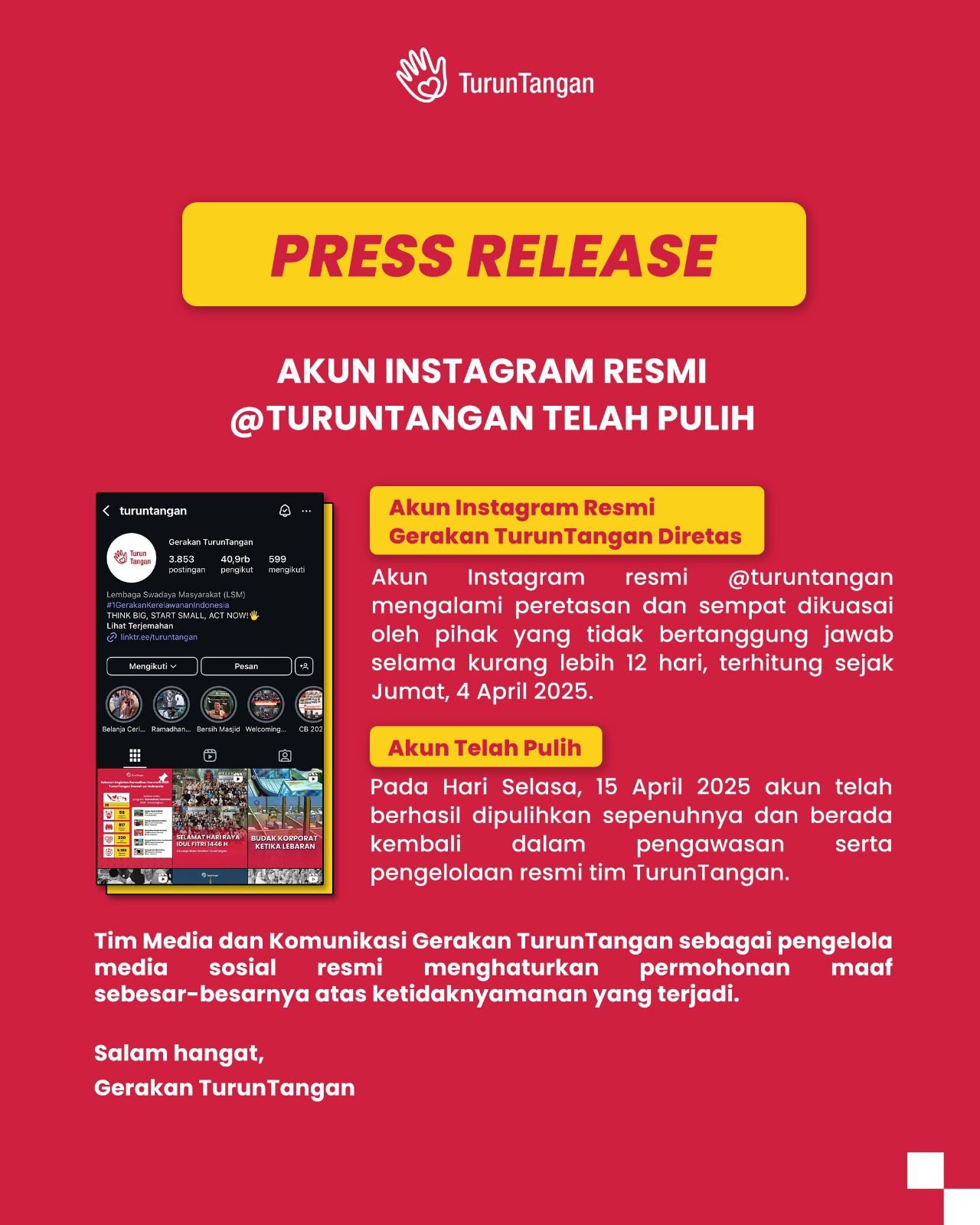 Jakarta, Edarinfo.com– Setelah sempat diretas selama hampir dua pekan, akun Instagram resmi Gerakan TurunTangan (@turuntangan) akhirnya berhasil dipulihkan dan kini telah kembali berada di bawah kendali tim pengelola. Peretasan terjadi…
