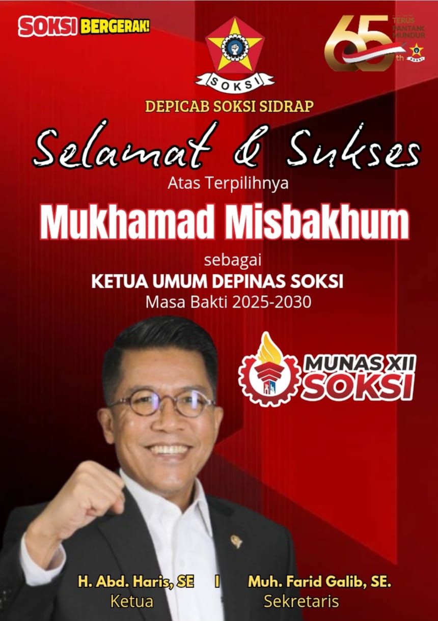 “Kami dari Depicab SOKSI Sidrap mengucapkan selamat dan sukses atas amanah besar yang diemban oleh Bapak Mukhamad Misbakhun. Semoga di bawah kepemimpinannya, SOKSI semakin solid, inklusif, dan berdampak nyata bagi masyarakat, khususnya kader-kader di daerah,” ujar H. Abdul Haris, SE Ketua Depicab SOKSI Sidrap.