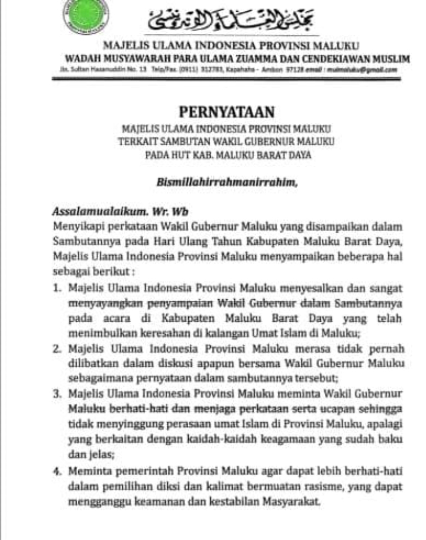 Pertama, MUI Maluku menyatakan sangat menyesalkan dan menyayangkan pernyataan Wakil Gubernur yang disampaikan dalam acara tersebut. Pernyataan tersebut dinilai telah menimbulkan keresahan di kalangan umat Islam di Maluku.