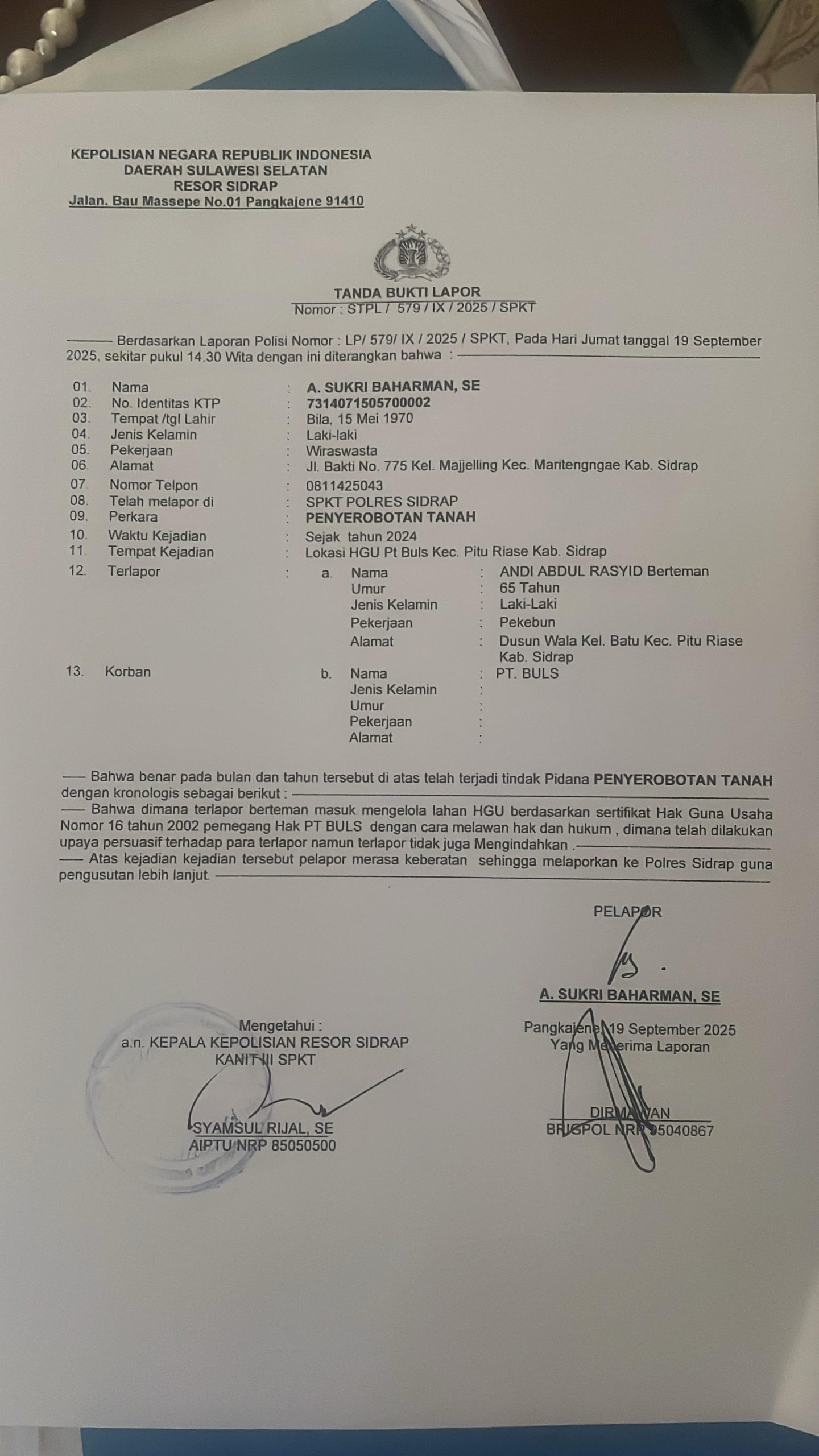 Namun, dalam proses sosialisasi, muncul sejumlah oknum yang diduga membawa orang luar untuk menyebarkan isu bahwa lahan yang digarap bukan milik PT Buls. Bahkan, dirinya sempat dilaporkan ke polisi dengan tuduhan pemerasan.