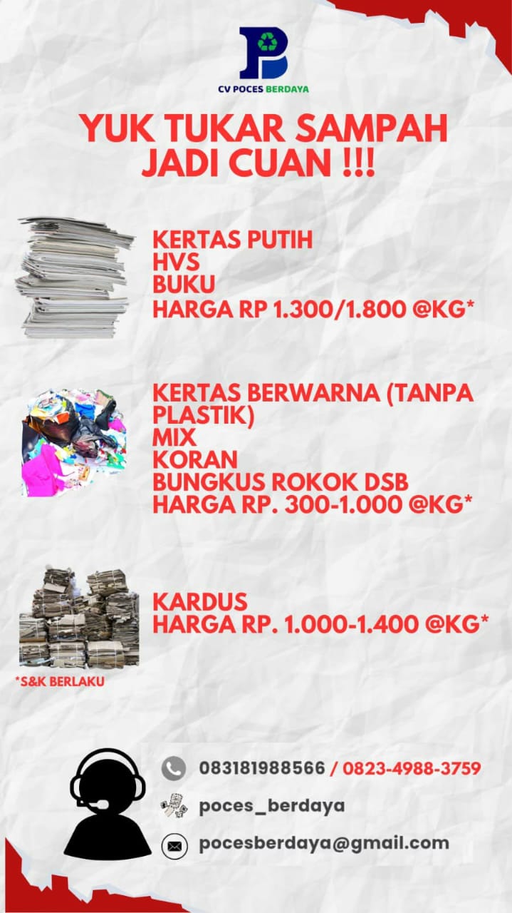 Adapun jenis sampah dan harga yang ditetapkan antara lain: kertas berwarna tanpa plastik atau campuran (mix) dengan harga Rp1.300 hingga Rp1.800 per kilogram; kertas koran, bungkus rokok, dan sejenisnya dengan harga Rp300 hingga Rp1.000 per kilogram; serta kardus dengan harga Rp1.000 hingga Rp1.400 per kilogram.